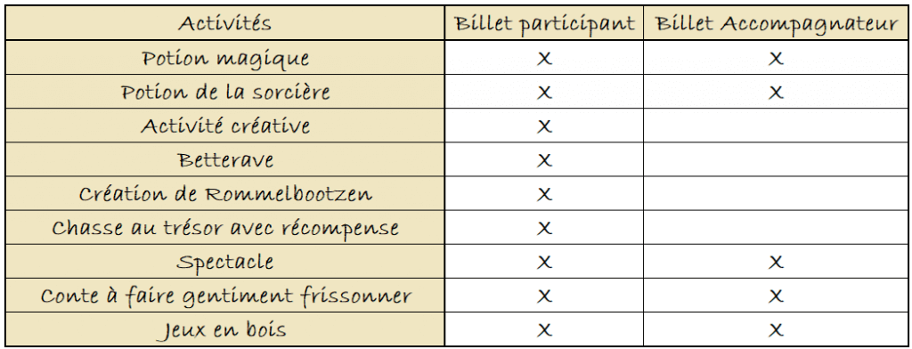 Le tarif participant donne accès à l’ensemble des activités et cadeaux proposés durant la soirée. Le tarif accompagnateur permet d’accompagner dans les différents ateliers.